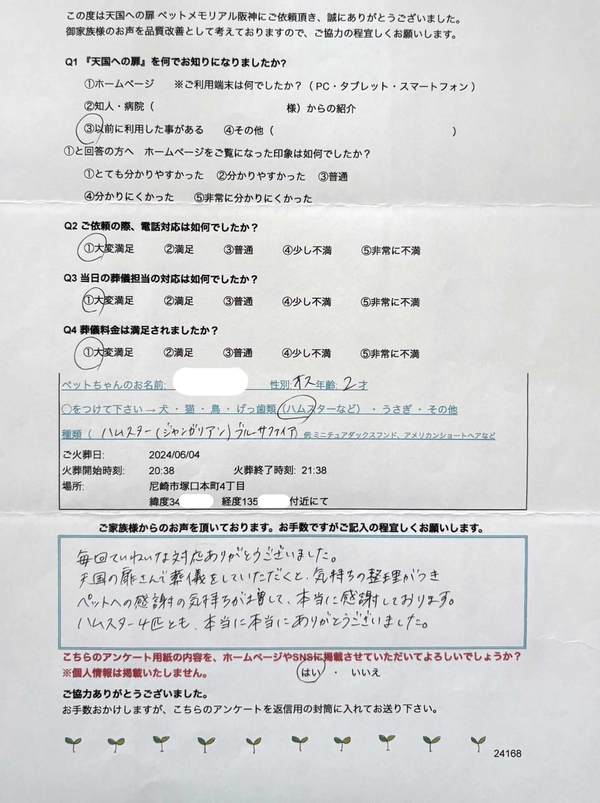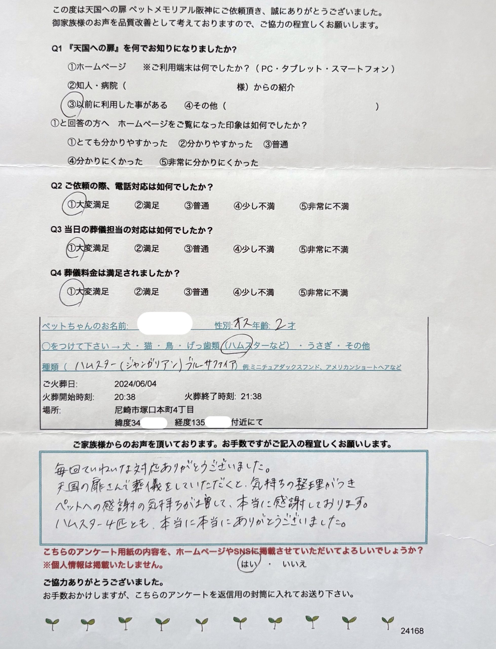 何もわからない私達に寄りそって頂き、Mちゃんのお話も聞いてくださり心優しい方にお任せして良かったっと感謝しております。