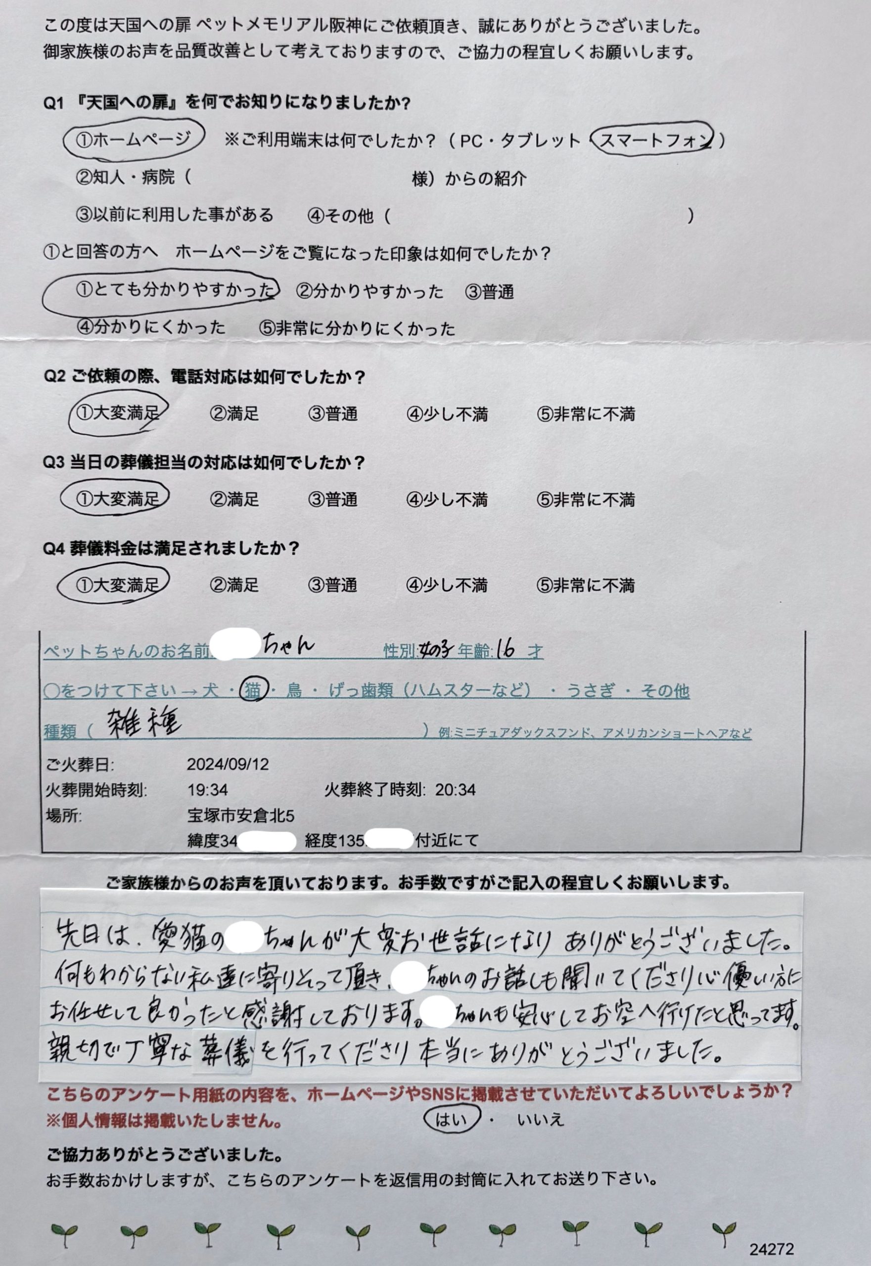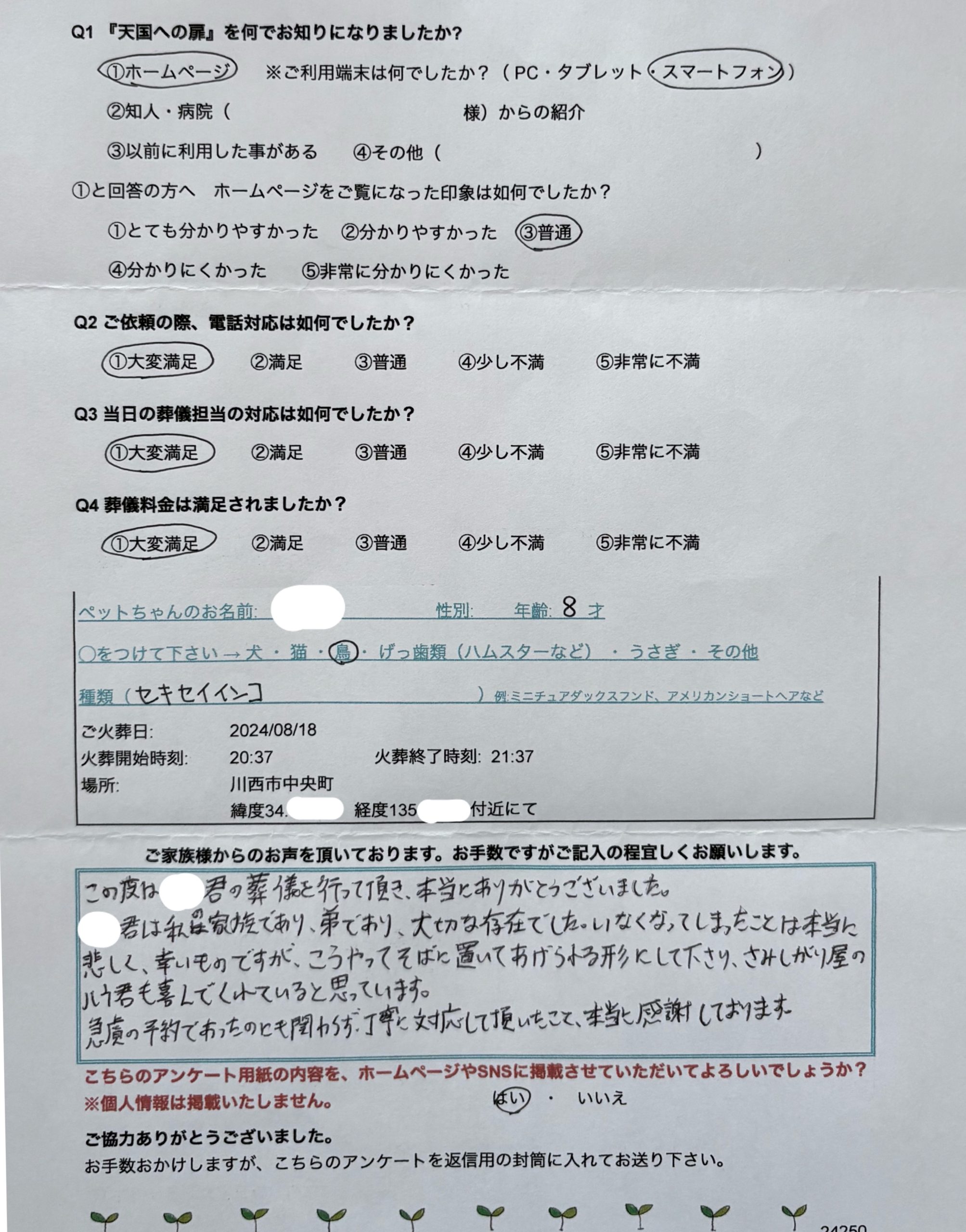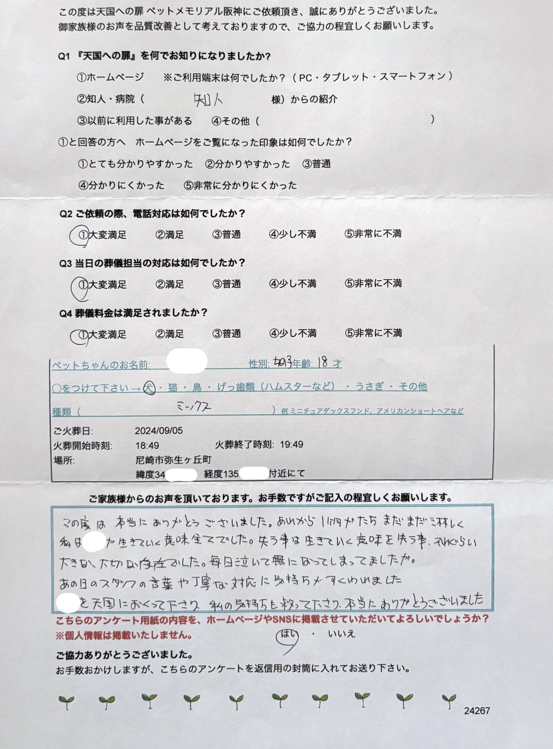 天国の扉さんで葬儀をしていただくと、気持ちの整理がつきペットへの感謝の気持ちが増して、本当に感謝しております。