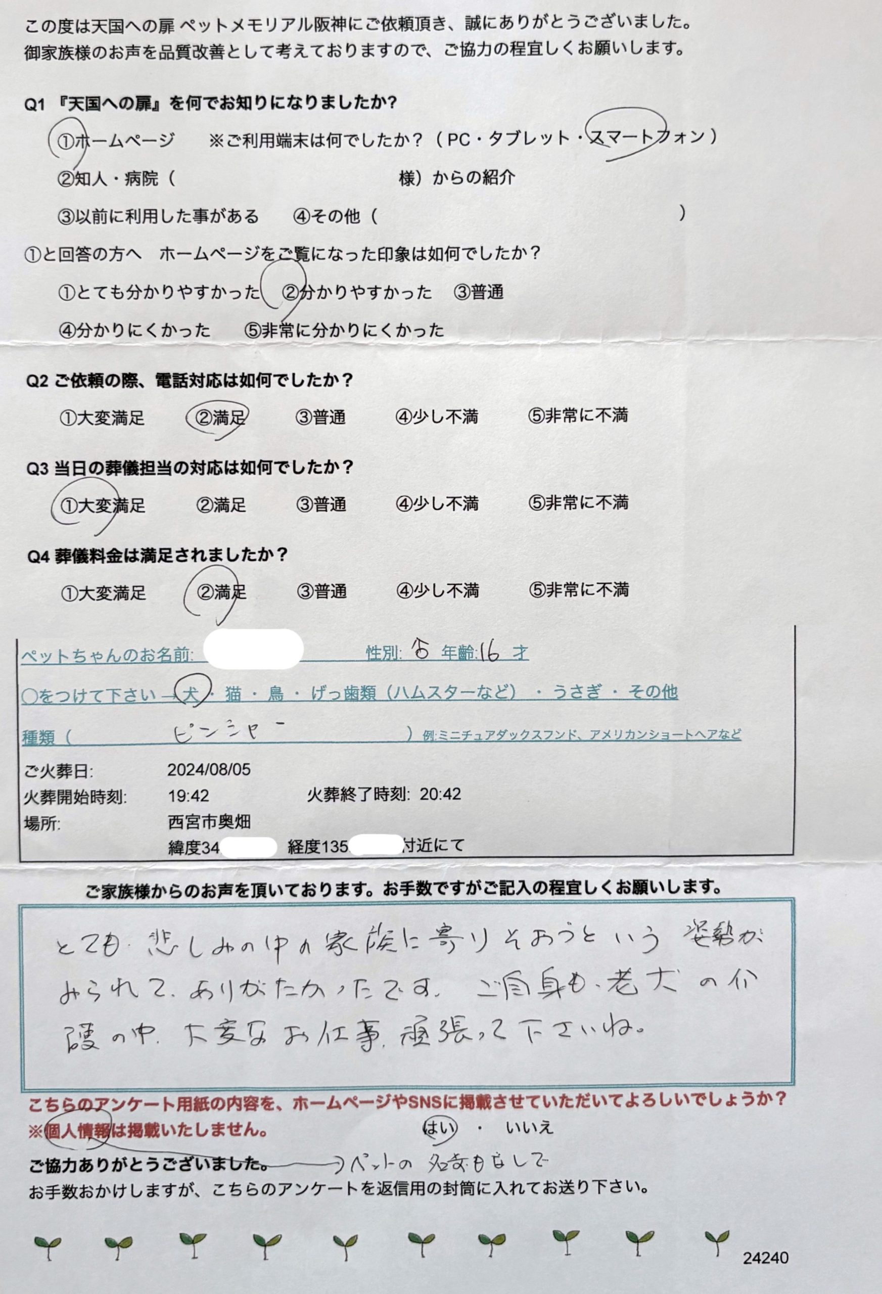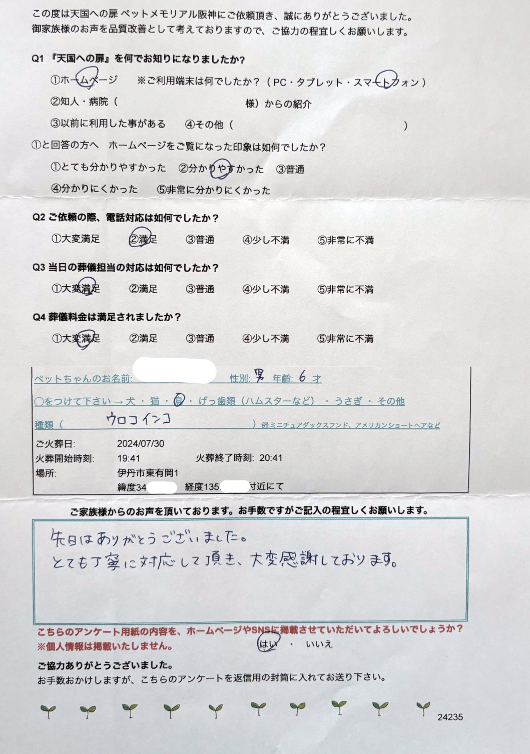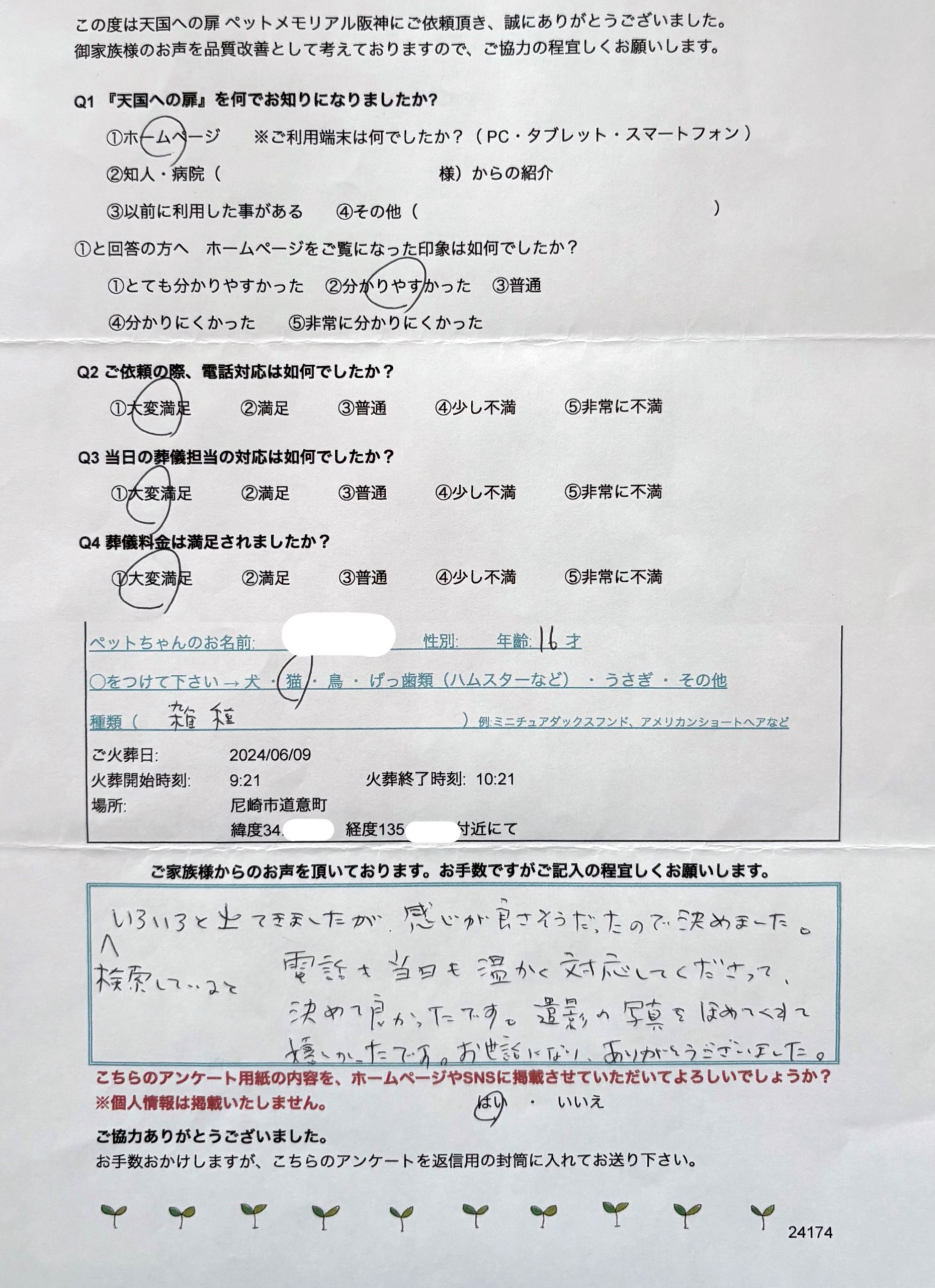 天国の扉さんで葬儀をしていただくと、気持ちの整理がつきペットへの感謝の気持ちが増して、本当に感謝しております。